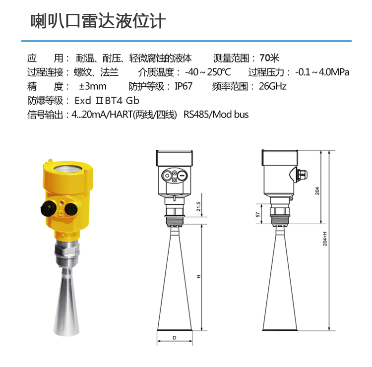 | 天線形式/材料 | B 喇叭天線Φ76mm/不銹鋼304 C 喇叭天線Φ96mm/不銹鋼304 D 喇叭天線Φ123mm/不銹鋼304 | ||||