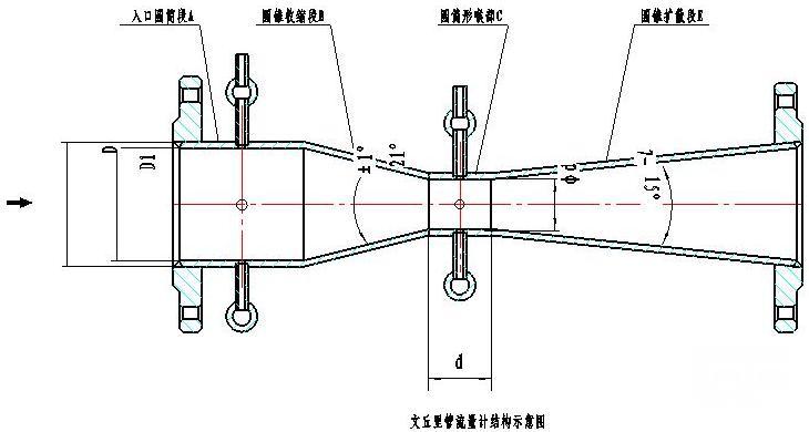 ●經(jīng)典文丘里管的軸向截面見(jiàn)上圖。它是由入口圓筒段A、圓錐收縮段B、圓筒形喉部C、圓錐擴(kuò)散段E組成。圓筒段A的直徑為D,其長(zhǎng)度等于D;收縮段B為圓錐形,并有21°±1°的夾角;喉部C為直徑d的圓筒形,其長(zhǎng)度等于d;擴(kuò)散段E為圓錐形,擴(kuò)散角7°~15°。