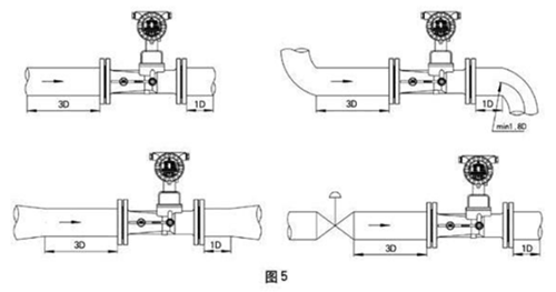 ⑦為了不影響流體正常輸送和便于維護,要求安裝旁通管道,并**前≥3DN、后≥1DN的直管段(圖6)。